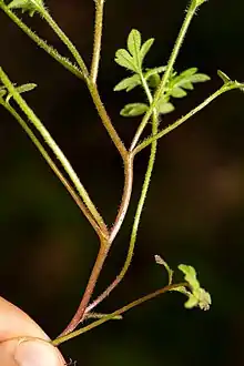 The main stem hairs are well dispersed, stiff, and non glandular which differs from those of P. ranunculacea.