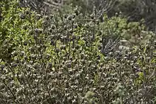 The inflorescence is a one-sided curving or coiling cyme of several bell-shaped flowers. The flower is just under a centimeter long and is white to cream in color with five protruding white stamens.
