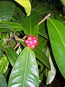| leaves & fruit of Phaleria octandra at Royal Botanic Gardens, Sydney, Australia | |