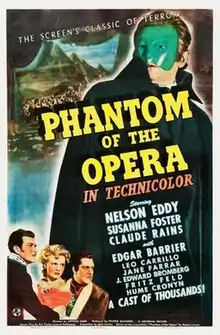 Phantom of the Opera is a 1943 American romantic horror film directed by Arthur Lubin, loosely based on Gaston Leroux's 1910 novel The Phantom of the Opera and its 1925 film adaptation starring Lon Chaney. Produced and distributed by Universal Pictures, the film stars Nelson Eddy, Susanna Foster and Claude Rains, and was composed by Edward Ward.