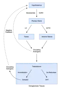 Bicalutamide increases androgen and estrogen levels only in men, and does not do so in women.[76][77][78] This is because androgen levels are comparatively far lower in women and in turn exert little to no basal suppression of the HPG axis.[78] Minimal or no changes of importance in levels of total testosterone, free testosterone, dihydrotestosterone, estradiol, androstenedione (A4), dehydroepiandrosterone (DHEA), dehydroepiandrosterone sulfate (DHEA-S), 3α-androstanediol glucuronide (3α-ADG), progesterone, 17α-hydroxyprogesterone (17α-OHP), LH, FSH, prolactin, or SHBG have been observed in women with hirsutism with or without polycystic ovary syndrome that were treated with 25 or 50 mg/day bicalutamide for 6 to 12 months.[95][96] However, in one study in women with polycystic ovary syndrome, 25 mg/day bicalutamide significantly decreased levels of total and free testosterone and significantly increased levels of SHBG.[97] In addition to the minimal changes in hormone levels in women, although bicalutamide monotherapy increases gonadotropin and sex hormone levels in men, this will not occur if bicalutamide is combined with an antigonadotropin such as a GnRH analogue, estrogen, or progestogen, as these medications maintain negative feedback on the HPG axis.[25][98][99][100]