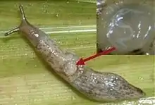 At this stage, depending on temperature, the weight of the gastropod, nematode density in the soil the host may die within 4 to 21 days,[3][5] however, studies show if large enough (over 1g), some slugs (e.g. Arion lusitanicus) can resist infection.[5][24] The process involved in killing the host is still not fully understood, whether it is due to internal damage from new offspring or the releasing of M. osloensis.[13] M. osloensis was found growing cultures of P. hermaphrodita [24] and was shown to kill slugs when injected in large amounts into D. reticulatum,[13] but it is not vertically transmitted to offspring, hence its role in the pathogenicity process is currently unclear.[28] When infected by P. hermaphrodita both morphological and behavioural characteristics of the slug change. Morphological changes include a swelling of the mantle area, where both fluid and reproducing nematodes accumulate.[3] Behavioral changes include the fact that infected slugs will be more attracted to areas with populations of P. hermaphrodita, increasing the reproductive fitness of the nematode. [29]