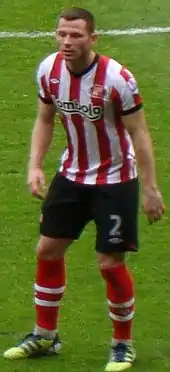 Bardsley made a poor start to the 2011–12 season as he was sent-off in a 1–0 defeat against rivals Newcastle United on 21 August 2011.[37] He was then handed a retrospective four-match ban by the FA for an altercation Juan Mata in a 2–1 defeat by Chelsea on 10 September 2011.[38] Despite this Bardsley retained his place in the side under Martin O'Neill, playing a total of 37 matches as Sunderland finished in 13th position.[39] He missed the start of the 2012–13 campaign after undergoing ankle surgery in August 2012.[40] Bardsley returned to the side at the end of October 2012, with the team struggling near the bottom of the table.[41] Paolo Di Canio replaced O'Neill in March 2013 and he guided the team to back to back victories over Newcastle United and Everton lifting the club away from the relegation zone.[42] Bardsley scored in the penultimate match of the season in a 1–1 draw with Southampton on 12 May 2013.[43] Bardsley missed the final match of the season away at Tottenham Hotspur after he and Matthew Kilgallon were pictured visiting a casino, angering Di Canio who vowed never to play the pair again.[44] Di Canio also fined Bardsley as well as six other Sunderland players for "indiscipline" which prompted an investigation by the PFA.[45]
