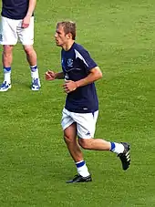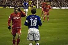 Neville's attitude, work rate and willingness to play anywhere saw him become one of manager David Moyes' favourites. On 8 August 2006, Neville was announced as vice-captain to David Weir, and – on Weir's departure to Rangers in January 2007 – he became the club captain.[16] In the Manchester United–Everton match on 29 November 2006, Phil and his brother Gary became the first siblings to captain their respective clubs against each other in the Premier League.[17]