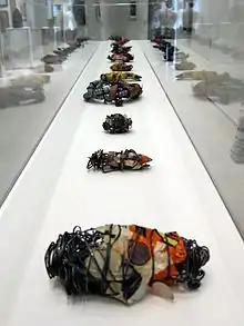 The passerby, Robert Leitch, gave the work to the Fleisher-Ollman Gallery in Philadelphia, which currently holds some of the work.[6] Nearly all the works are wire-bound bundles, except a few abstract marker drawings reminiscent both of Mark Tobey and J.B. Murry. The artist tightly wound wire around objects including plastic, packaging, nuts, bolts, newspaper/magazine cutouts, electrical parts, batteries, coins and other items. Some bundles used rubber bands or tape to bind the objects together. Based on internal evidence, the collection has been dated to around 1970.