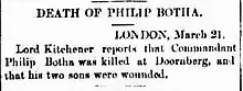In January 1901 Philip Botha ordered the execution of British Lieutenant Cecil Boyle who was accused of ill treatment of Boer women and children in Dewetsdorp.[7][8] Botha was called upon to account for this, but was killed in action in a small skirmish with British troops at Doornberg near Ventersdorp on 6 March 1901.[9]
