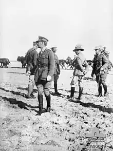 In World War I, Chetwode served on the Western Front: his 5th Cavalry Brigade helped cover the retreat from the frontier, and checked the pursuing Germans at Cerizy on 29 August 1914.[2] After taking part in the First Battle of Ypres in October 1914, he was appointed General Officer Commanding 2nd Cavalry Division with promotion to temporary major-general on 15 July 1915[13] and to substantive major-general on 1 January 1916.[14] With the war in Europe become bogged down in trench warfare, Chetwode was lucky to be transferred to the Palestine where he was given command of the Desert Column and promoted to temporary lieutenant general with effect from 22 November 1916.[15] He led the corps at Rafa in January 1917 and at the First Battle of Gaza in March 1917.[16] When Edmund Allenby took command of the Allied forces in Palestine in June 1917, Chetwode was promoted to command of XX Corps.[16] He led his corps to military success at the Battle of Beersheba in October 1917 and at the Battle of Jerusalem in November 1917.[17] During the Sinai and Palestine campaign he was mentioned in despatches eight times.[16]