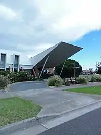 In 1993, Harmer won his second RAIA award with the development of the monumental Altona Meadows/Laverton Uniting Church.[4] The design of the building was inspired from an aircraft hangar because of the recognition of the aviation industry in Melbourne.[6] The six curve-shaped iron pieces supports the main part of the building in which, "The curved roof form has been chosen for functional and economic reasons [where] the principal worship space is located centrally under the highest part of the roof with the secondary spaces grouped at each end..."[6] There are also movable walls inside the building, which can create more open or closed spaces. According to Goad, Harmer's choice of using bold shapes, strong colors and graphic structural expressions allows one to travel back to the structural-functional era when churches reflected postwar liturgical advances.[6][7]