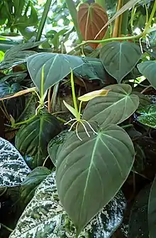 Philodendron hederaceum,[1] the heartleaf philodendron (syn. Philodendron scandens) is a species of flowering plant in the family Araceae, native to Central America and the Caribbean which is common in the houseplant trade. Philodendron hederaceum var. hederaceum, the "velvet philodendron," is a subspecies which is in the houseplant trade under its previous name of Philodendron micans.[2] While toxic under certain conditions, it is also under current review for numerous health benefits.[3]