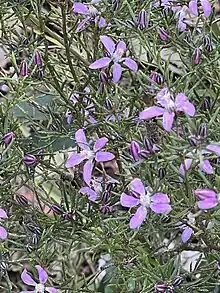 Philotheca salsolifolia is a shrub that typically grows to a height of 2 m (6 ft 7 in) and has more or less glabrous branchlets. The leaves are crowded, thick and from cylindrical, 3–5 mm (0.12–0.20 in) long to narrow, pointed and up to 12 mm (0.47 in) long. The flowers are arranged singly or in twos or threes on the ends of branchlets, each flower on a top-shaped pedicel 1–2 mm (0.039–0.079 in) long or a thin pedicel about 8 mm (0.31 in) long. The five sepals are triangular, about 1.5 mm (0.059 in) long and the five petals are narrow elliptic, 6–12 mm (0.24–0.47 in) long and pink to mauve with a dark central stripe. The ten stamens are glabrous, fused together in the lower half, and densely hairy above. Flowering occurs from September to December and the fruit is 5–6 mm (0.20–0.24 in) long with a pointed tip.[2][3][4]
