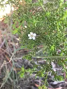 Philotheca sporadica, commonly known as Kogan waxflower,[2] is a species of flowering plant in the family Rutaceae and is endemic to south-eastern Queensland. It is a shrub with small, narrow oval leaves with the narrower end toward the base and white flowers with a pink midrib, usually arranged singly on the ends of branchlets.