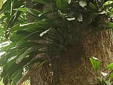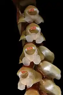 Pholidota imbricata, commonly known as the common rattlesnake orchid[2] or necklace orchid,[3] is a plant in the orchid family and is a clump-forming epiphyte or lithophyte with crowded pseudobulbs. Each pseudobulb has a single pleated, leathery leaf and up to sixty white, cream-coloured or greenish, cup-shaped flowers in two ranks along a wiry flowering stem. There is a large, papery bract at the base of each flower. This species is native to areas from tropical and subtropical Asia to the southwest Pacific.