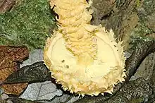 The cap surface is dry, matt and felt-like, and in wet conditions may lose scales. The cap margin remain curved slightly inwards. The yellow gills are crowded together, attached to the stem, and have a notch where the gill attaches to the stem.[9] A bright yellow partial veil extending from the cap edge to the edge is present in immature species. As the cap expands and flattens with age, the partial veil tears, leaving a faint ring around the stem. The cylindrical straight or curved stem is itself covered in yellow squamules below the ring. The base of the stem, typically more orange in color than the upper portion,[9] is firmly attached to the dead wood from which the fungus arises. The section of stem above the ring bears little or no protuberances. The flesh is firm, full, yellow and does not change color when bruised or injured.