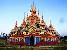 A temporary mortuary chapel called neibban kyaung (နိဗ္ဗာန်ကျောင်း), with a multi-tiered pyatthat roof, is constructed to house the coffin.[7] The monk may lie in state for several months, while donations are gathered to fund the cremation ceremonies.[7] A massive funerary pyre tower called laungdaik (လောင်တိုက်), representing Mount Meru, along with numerous subsidiary towers, is also constructed by specialist bamboo artisans called sat-hsaya (စပ်ဆရာ).[7]