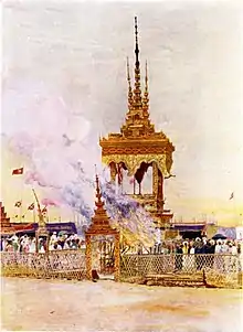 A staged play called eiyin (ဧယင်), which reflects the pain of the living mourning the departed and combines the Buddhist concept of rebirth and the monk's virtues and life, is performed from the moment the coffin leaves the monastery to the time of cremation.[1] These performances are held during the daytime, generally held in temporary gilt pavilions called san kyaung (စံကျောင်း), which are erected in the monastery grounds or the village squares.[1] Controversy has surrounded the expenses involved in financing such expensive ceremonies.[9]
