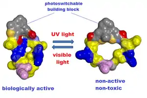 The initial peptides were successfully used to kill B-cell lymphoma cancer cells. The reference synthetic short peptide was alkylated with azobenzene crosslinkers and used to photo-stimulate mitochondrial membrane depolarization and cytochrome c release in permeabilised cells, which were the initial events of the intrinsic apoptosis pathway.[8] Gramicidin S analogues containing a diarylethene fragment[6] display clear-cut reversible change of antimicrobial activity. In an inactive, UV-inducible photo-form they are harmless to bacteria cells, but are bactericidal after the activation with visible (amber) light.