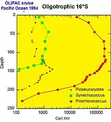 - Cyanobacteria belonging to the genus Prochlorococcus are particularly remarkable. With a typical size of 0.6 µm, Prochlorococcus was discovered only in 1988[7] by two American researchers, Sallie W. (Penny) Chisholm (Massachusetts Institute of Technology) and R.J. Olson (Woods Hole Oceanographic Institution). In spite of its small size, this photosynthetic organism is undoubtedly the most abundant of the planet: indeed its density can reach up to 100 million cells per liter and it can be found down to a depth of 150 m in all the intertropical belt.[17]