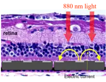 - ↑ H. Lorach; et al. (2015). "Photovoltaic Restoration of Sight with High Visual Acuity". Nature Medicine. 21 (5): 476–482. doi:10.1038/nm.3851. PMC 4601644. PMID 25915832.