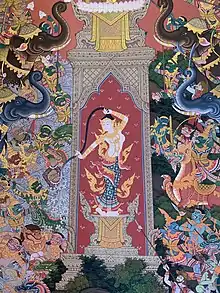 Wat Phnom Mural: Phra Mae Thorani placing herself between the demons and Gautama Buddha