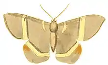 Upper Side. Antennae filiform. Body grey. Wings pale yellowish grey. A narrow yellow bar rises near the middle of the anterior wings, which, crossing them and the posterior, ends a little below the body on the abdominal edges; another small bar crosses the anterior wings near the shoulders, both of them being verged with silver. A small dark spot, surrounded with silver, is also placed close to the external edges of the posterior wings; and above it is a yellowish patch reaching to the upper corners.