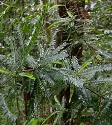 The plant appears as monoecious shrubs or small trees ranging from 0.5 to 9 meters,[7][8] with its trunk reaching up to 2.1 meters with a diameter of up to 25 cm. The bark is rough and greyish-brown, with the asymmetrical leaves being distichous numbering between 20 and 70 leaves per branchlet. P. balgooyi produces 3-lobed, capsular greenish-brown or greenish-yellow fruits.[7]