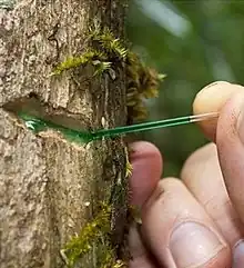 The plant's sap is notable for being of a bright green color due to the high nickel content, with up to 16.9% nickel by weight and the sap is described as "one of the most unusual biological liquids".[6][1] This figure is the second highest recorded concentration of nickel of any living material, behind a 25% figure for a Pycnandra acuminata sample from New Caledonia.[13] Due to its bioaccumulation capabilities, P. balgooyi has been brought forward as a potential candidate for phytomining (i.e. extracting metals from plants), to be utilized in soils where the nickel concentration is too low for commercial mining operations.[14]
