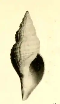 The white, fusiform shell is not very solid. The turreted spire is fairly high. The shell contains seven convex whorls, separated by a well-marked suture. The only remaining whorl of the protoconch is adorned at the top with arched longitudinal costules and, below, with a very fine and tight diagonally cancellated sculpture. The six subsequent whorls are adorned with 4 or 5 decurrent, distant cords, narrow, well-protruding and with growth lines strongly arcuated on the infra-sutural area and almost perpendicular below this. The growth lines, crossing the funicles, form transversely undeveloped tubercles. The body whorl, which occupies 3/4 of the total height, shows 26 decurrent cords. Those located below the periphery and on the siphonal canal, are much weaker and closer together than the others. The growth lines are also more irregular and weaker on this whorl than on the others. The aperture is elongated and a little angular in the top. It ends in an open and rather elongated siphonal canal. The columella is almost upright, attenuated and elliptical at the base. The outer lip is arcuate and acute. [2]