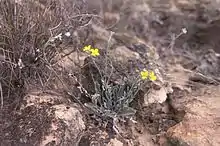 This is a perennial herb producing one or more spreading stems from a woody base. The stems grow to 80 centimeters in maximum length. The herbage is silvery in color due to a coat of branching hairs. The leaves are oval to lance-shaped and smooth to faintly toothed on the edges, the lowest leaves reaching 12 centimeters long. The inflorescence is a raceme of yellow flowers.[3] Blooming can occur through September whenever there is enough moisture.[3] The population size can also increase rapidly after a significant amount of rainfall.[2]