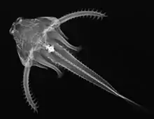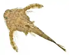 Physopyxis have an extremely small size among doradids, not exceeding 3.5 centimetres (1.4 in) SL.[1] Their pectoral fin spine reaches the base of the anal fin, and the dorsal fin spine is serrated only at the anterior margin of its base.[2] There are three pairs of barbels, one pair of maxillary barbels and two pairs of mental barbels. The dorsal and pectoral fin spines are strongly ossified and well-developed.[2]