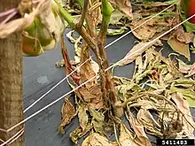 Crop rotation may reduce the number of pathogens in the soil and, "a minimum of a 3 years crop rotation which alternates with non-host species is recommended to avoid build-up of P. capsici spores." Crops should also avoid conditions that would be conducive to the pathogen by using well drained soils and raised beds.[3] As stated above, "Excess moisture is the single most important component to the initial infection and subsequent spreading of Phytophthora capsici."[4] Overall, a study by K.H. Lamour and M.K. Hausbeck found that "crop rotation and mefenoxam are not likely to provide economic control".[10] Mefenoxem is the active enantiomer contained in the racemic fungicide metalaxyl used to defend against Phytophthora capsici. Sexual recombination provides the genetic diversity to promote resistance towards fungicides in P. capsici. The failure of crop rotation as a means to control P. capsici may also be due to weeds playing the role of an alternative host in the absence of common hosts. According to a study done by the University of Florida, "In Florida, and perhaps elsewhere, weeds may contribute to pathogen survival in the absence of a host crop or when propagules may not readily survive in soil or plant debris."[11] To avoid fruit rot of vegetable crops in the Cucurbitaceae, trellising cucurbit fruits and other ways to keep the fruit off the ground is a way to control secondary inoculants (zoospores) from physically being splashed from the soil onto the fruit.[4] Control of Phytophthora capsici is easier in drier climates with less rainfall such as California. In these areas, it is important to practice placing drip irrigation emitters away from the stems of pepper plants in order to reduce the incidence of crown rot in peppers.[12]