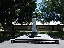 Pialba chose a monument for its war memorial, although some had preferred a memorial School of Arts building.[8] In late 1918 Councillor W Whitaker and Albert Whitford, Member of the Queensland Legislative Assembly, asked the Commissioner for Railways for a suitable site for a memorial "for fallen soldiers", and a site was granted in Station Square, an open area between the Pialba railway station building and Main Street, by August 1918.[9] The location was apt, as many of the men would have departed via the railway station. The Pialba Farewell and Reception Committee (established c.1917) directed the movement, through a memorial committee. The memorial was to consist of a marble monument, with four panels (one on each face of the monument) listing the names of those who enlisted from the district and those who had died.[10][11][12][13][1]