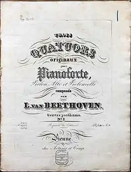 Beethoven later reused material from the C major quartet for two of his early Piano Sonatas: No. 1 and No. 3.[1] In Beethoven's original manuscript, the work in C major comes first, followed by E-flat major and D major. When the quartets were published after his death by Artaria in Vienna, there were in a different order: E-flat major, D major and C major.[2]