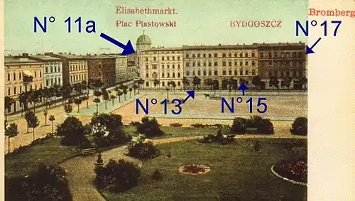 First address was 5 Elisabeth Markt, the first owner was a rentier, Arthur ßaulini,[14] who resided at neighbouring Nr.4 (now Nr.13).[15] In 1910, the edifice moved to the hands of Carl Rose, a famous architect in Bromberg living on 29 Danzigerstraße.[16]