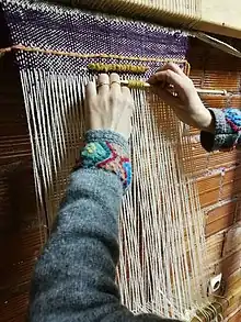 The pibiones or grain weaving technique is most commonly found in the central and eastern areas of Sardinia, Italy.[1] This is a particular type of stitched relief, where the pattern is formed from the countless grains incorporated into the cloth during weaving. These are made by twisting the weft yarn around a needle which is arranged in a horizontal position on the loom; after the thread is beat into place, the needle is then pulled away, leaving behind a raised effect (grains).[2]