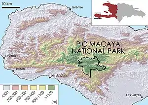 Pic Macaya National Park (French: Parc National Pic Macaya) is one of two largest national parks of the Republic of Haiti. It is located in the country's southern peninsula, within the Massif de la Hotte. Featuring the country's last stand of virgin cloud forest, it encompasses more than 8,000 hectares. Elevations in the rugged park reach a maximum height of 2,347 meters (7,700 feet) above sea level at Pic Macaya (Macaya Peak), the second highest point in Haiti behind Pic la Selle.[3] A majority of the park is composed of two tall peaks: Pic Macaya and Pic Formon.
