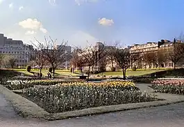 Following the demolition of the hospital, the use of the empty site was uncertain for some years. There was a proposal to erect a new municipal art gallery on the site, and plans were drawn up by the architect Ernest Berry Webber for a large Neoclassical building.[12] However, this scheme was never realised and the city's fine art collection remained in the Manchester City Art Gallery on nearby Mosley Street. Another scheme put forward by the architect Richard Carpenter was to build a large new replacement for Manchester Cathedral on the site. In 1917, the conductor Thomas Beecham proposed the construction of a large opera house, but he went bankrupt before he could advance this plan any further. The "Great Hole of Piccadilly" remained empty throughout the 1910s and 1920s. In the 1930s, it was finally decided not to erect a new building on the former hospital site, but to turn it into a public garden. The area was landscaped and a sunken garden was laid out on the footprint of the former hospital basement, with formal flower beds, a rose garden and flowering cherry trees.[13][8]