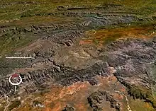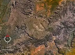 The site is marked by a circular topographic feature on top of the flat-topped sandstone and conglomerate Bungle Bungle Range, clearly visible on remotely sensed images.[2] When first reported in 1983 after aerial observation, it was interpreted as either an impact structure or a cryptovolcanic feature.[3] Later ground examination by E.M. and C.S. Shoemaker confirmed the presence of types of deformation confirming an impact origin.[4]