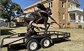 The Ponca City News reported in September 2022 that Pickens Museum was putting the monumental bronze "Osage Warrior in the Enemy Camp” by Osage artist John Free on exhibit in Ponca City. The bronze, 12 feet long and 8 feet high, was commissioned by Pickens Museum and is on temporary display on Coppercreek in Ponca City. “I invite the public to drive by and see it,” said Hugh Pickens, Executive Director of Pickens Museum. “You can get out of your car and come over next to it if you wish to take photos but for safety reasons, please stay off the trailer.”[19]