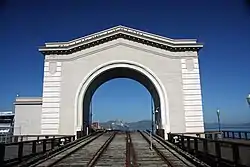 The Pier 43 Ferry Arch is an historic ferry arch at Pier 43 in San Francisco's Fisherman's Wharf, in the U.S. state of California.[1] Its headhouse, a decorated hoisting tower for loading and unloading rail cars on and off ferries, was built in 1914 to serve the Belt Railroad. The wood pier was replaced in 1996. The headhouse was rehabilitated in 2002–2003 to the Secretary of the Interior's Standards after a fire in 1998.