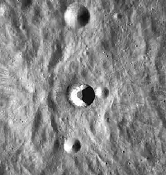 This crater produced a broad, wispy ray system that extends for more than 100 km in all directions. The ejecta blanket contains multiple lobate impact melt flows, that extend to over 40 km from the centre of the 9.3 km diameter crater, and that appear dark in contrast to the surrounding material.[2]