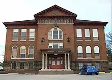The Pierce School building was designed by Davenport architect Parke T. Burrows of the local firm Clausen & Burrows.[3] The square block building is two stories high on a raised basement. In the center of each elevation is a projecting pavilion that is capped with a triangular pediment. It is built with red bricks and the basement is faced with large blocks of dressed limestone.[6] The building features a hipped roof with bracketed eaves. It has round arch windows on the main floor and rectangular windows on the second floor and on the basement level. A columned canopy covers the main entrance. The grouping of windows beneath round-arched brick arcades reflect the Richardsonian Romanesque style that was popular in the late 19th century. It is combined with a return to Neoclassicism, which is found in its symmetry of form and massing, the pavilion pediments, and the small windows in deep reveals that form a frieze.[3]