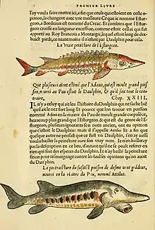 His first book was Histoire naturelle des estranges poissons (1551) and despite its title was a work mainly on the dolphin;[lower-alpha 1] it did have woodcuts of some fishes, possibly the first among printed books in the West.[7]