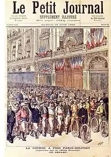 On 5 June 1892,[1] Giffard organised a foot-race from Paris to Belfort, a course of over 380 kilometers, the first large scale long-distance running race on record. Over 1,100 competitors registered for the event and over 800 started from the offices of Le Petit Journal, at Paris Opera. This had also been the start point for the inaugural Paris–Brest–Paris cycle-race the previous year.[1] Newspaper circulation dramatically increased as the French public followed the progress of race participants, 380 of whom completed the course in under 10 days. In Le Petit Journal on 18 June 1892, Giffard praised the event as a model for the physical training of a nation faced by hostile neighbours.[1] The event was won by Constant Ramoge in 100 hours 5 minutes.[7]