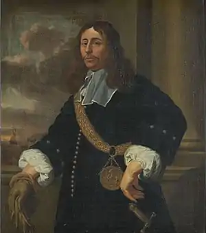 Of Pieter de Bitter's early life and career nothing is known. His name first emerges in 1653, when during the First Anglo-Dutch War he is mentioned as the captain of the Mercurius, a vessel of forty cannon of the Dutch East India Company, that had been allocated to the squadron of Commodore Michiel de Ruyter, just prior to the Battle of Scheveningen.[1] In that fight De Bitter distinguished himself by disabling HMS Triumph of 62 guns, the flagship of Vice-Admiral James Peacock who was killed. An hour later the Mercurius sank after having been penetrated below the waterline; De Bitter was saved with most of his crew.