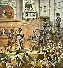 Acciarito's trial took place on 28-29 May 1897, at the Rome Court of Assize. Chief prosecutor Eugenio Forni hoped to establish a connection between the attack and the anarchist movement although Acciarito denied such a connection existing, never referring to anarchist principles, ideas or even identifying as one. Acciarito was found guilty and sentenced to life in prison, with the first seven years spent in solitary confinement in chains and provided with a diet which could barely sustain life. Acciarito seemed unfazed, with him commenting "Very well, me today, tomorrow the bourgeois government. Long live the social revolution!. Long Live Anarchy!".[1][2][3]