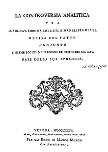 From 1797 to 1799, he wrote Origin, Transmission to Italy, and Early Progress of Algebra There (Italian: Origine, transporto in Italia, primi progressi in essa dell'algebra), in which he describes mathematical achievements from the emergence of algebra due to Fibonacci to the new research on casus irreducibilis in the 18th century. This work can be considered the first professional text on the history of Italian mathematics. In this work, Cossali corrects some factual mistakes made earlier by Jean Paul de Gua de Malves, John Wallis and Jean-Étienne Montucla, although he makes another important error in attributing everything after Fibonacci and before Luca Pacioli to the latter.[1]
