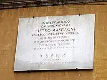 Mascagni died on 2 August 1945 in his apartment at the Grand Hotel Plaza in Rome. The funeral ceremony was on 4 August. The Italian authorities were not present. In 1951, his body was transferred from Rome to Livorno, where Mascagni finally received an official homage. On 7 December 1963, the centenary of Mascagni's birth, a plaque was erected in Rome on the Albergo del Sole where Mascagni stayed during the premiere of Cavalleria rusticana.