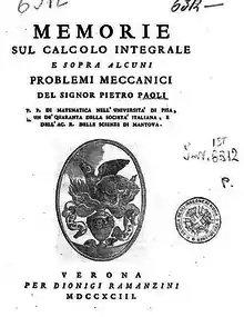 Paoli worked mainly in calculus and his applications to optics and mechanics. In spite of his duties, there are only two works on hydraulics.[3] His main work was Elementi di Algebra in two volumes (1794) which was widely distributed in Italy for many years.[4]