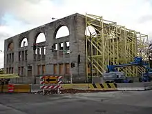 After the fire, the brick and stone of the outer walls still stood near-complete and were determined to be structurally sound. A steel support skeleton was later attached to the outside to brace the walls for a possible later reconstruction of the interior of the building and restoration of the façade.