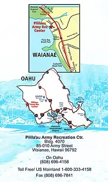 Pililaau Army Recreation Center (part of the Armed Forces Recreation Centers system of the United States Department of Defense) is located on the island of Oahu and provides 39 beachfront cabins, one visitor cabin, an equipment rental center and a pavilion for active duty, reserve, national guard, retired military, and DoD civilian personnel to use. Located at Pokai Bay, PARC is 35 miles from Waikiki and 18 miles from Schofield Barracks, on the Leeward Coast.